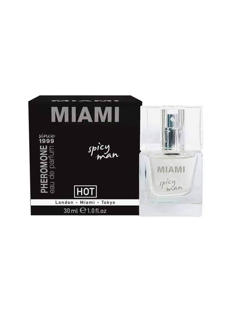 Πικάντικο, μυστηριώδες και μεθυστικό, γεμάτο με τις υπέροχες ευωδιές του ήλιου και της θάλασσας, το MIAMI Spicy Man “ξεχειλίζει” από τα μαγευτικά αρώματα του γκρέιπφρουτ, του κεχριμπαριού, του πατσουλιού και του guaiacum και έναν αξεπέραστο συνδυασμό φερομονών Androstenone (αναδεικνύουν την δυναμικότητα και μαχητικότητα του ατόμου) και Androstenol (είναι συνδεδεμένες με την γονιμότητα και το σφρίγος της νεότητας),εφοδιάζοντάς σας με ένα ακαταμάχητο, ερωτικό όπλο που δεν θα αφήσει καμία γυναίκα ασυγκίνητη.
