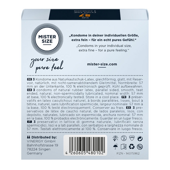 Στο εξής, με το MISTER SIZE L57mm, το προσωπικό σας προφυλακτικό από την εταιρία Mister Size, η εφαρμογή δεν θα σας δημιουργήσει ποτέ ξανά πρόβλημα Νιώστε και πάλι ελεύθεροι και απολαύστε το σεξ με όλες τις αισθήσεις σας.