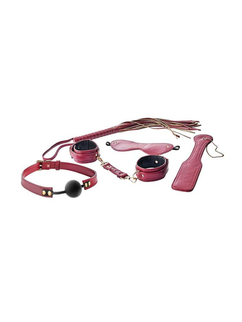Το σετ περιέχει τα 5 απόλυτα must have ερωτικά αξεσουάρ που ένας kinky lover χρειάζεται για τις σεξουαλικές του συνευρέσεις: Σε αριστοκρατικό κόκκινο Βουργουνδίας.