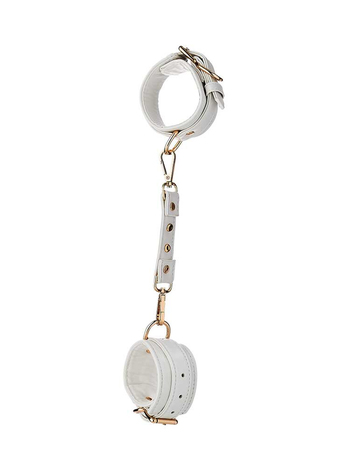 Handcuffs: Ένα ζευγάρι στιβαρές χειροπέδες καρπού κατάλληλες για δυνατά δεσίματα Οι χειροπέδες ασφαλίζουν πλήρως μέσω μίας ρυθμιζόμενης, μεταλλικής αγκράφας και προσαρμόζονται άψογα στις επιθυμητές κάθε φορά διαστάσεις. Μία αποσπώμενη αλυσίδα 10cm με δερμάτινες και μεταλλικές λεπτομέρειες ενώνει, μέσω στέρεων D-Rings, τις δύο μανσέτες μεταξύ τους για πλήρη ακινητοποίηση. Στους δακτυλίους μπορείτε να προσαρτήσετε και άλλα bondage αξεσουάρ της συλλογής σας για να εμπλουτίσετε το παιχνίδι σας.