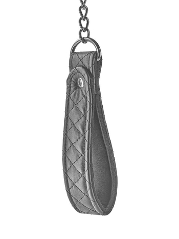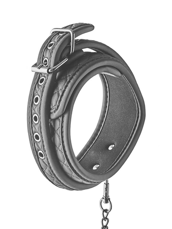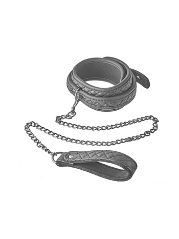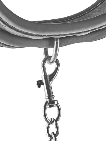 Σαγηνευτικά αμαρτωλό, το σετ αποτελείται από δύο κομμάτια. Ένα βελούδινα απαλό, μαύρο κολάρο, κατασκευασμένο από καπιτονέ τεχνητό δέρμα με ανάγλυφα σχέδια που θυμίζουν μικρά διαμάντια, στο εσωτερικό του οποίου υπάρχει απαλή επίστρωση από νεοπρένιο, υλικό ιδιαίτερα μαλακό, ιδανικό για άνετη, πολύωρη χρήση και ταυτόχρονα εξαιρετικά ανθεκτικό, κατάλληλο για άγρια, δυναμικά παιχνίδια, καθώς και μία αποσπώμενη, μακριά, μεταλλική αλυσίδα ( λουρί) με καπιτονέ ιμάντα για τον καρπό. Το κολάρο ρυθμίζεται πλήρως και εφαρμόζει τέλεια σε όλα σχεδόν τα μεγέθη, ενώ ασφαλίζει μέσω μίας ανθεκτικής, αγκράφας για στιβαρά δεσίματα.