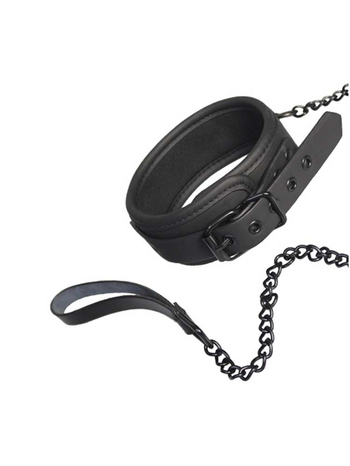 Κομψό και φινετσάτο, το σετ περιλαμβάνει ένα βελούδινο στην αφή, μαύρο κολάρο, κατασκευασμένο από νεοπρένιο, υλικό ιδιαίτερα μαλακό, μα ταυτόχρονα και απόλυτα ανθεκτικό, ιδανικό για έντονο παιχνίδι, στο εσωτερικό του οποίου υπάρχει απαλή επίστρωση, για άνετη, πολύωρη χρήση και και μία αποσπώμενη, μακριά, μεταλλική αλυσίδα ( λουρί) με ταιριαστό ιμάντα για τον καρπό. Το κολλάρο ρυθμίζεται πλήρως και εφαρμόζει τέλεια σε όλα σχεδόν τα μεγέθη, ενώ ασφαλίζει μέσω μίας ανθεκτικής, αγκράφας για απόλυτα στιβαρά δεσίματα.
