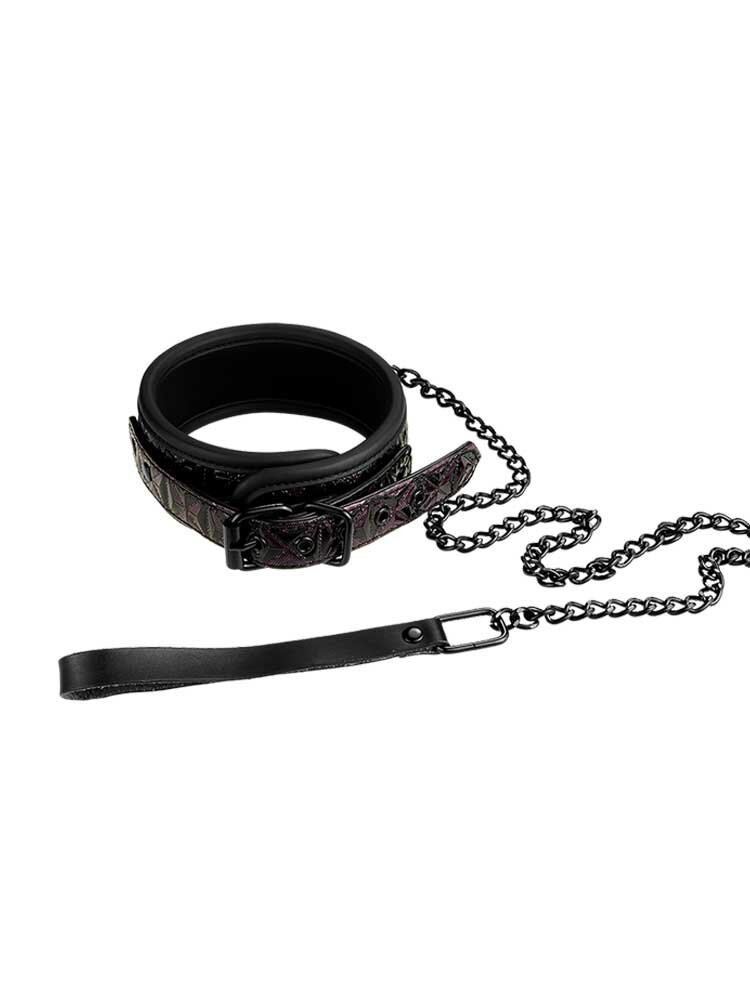 Σαγηνευτικά αμαρτωλό και σέξι, το παιχνίδι αποτελείται στην ουσία από δύο αξεσουάρ. Ένα απαλό, μαύρο κολάρο, κατασκευασμένο από συνθετικό δέρμα, με υπέροχα γυαλιστερά ανάγλυφα μαύρα-μοβ σχέδια που λαμπυρίζουν ελαφρά και εσωτερικό επενδυμένο με απαλή επίστρωση από νεοπρένιο, υλικό ιδιαίτερα μαλακό, ιδανικό για πολύωρη χρήση και παράλληλα εξαιρετικά ανθεκτικό, κατάλληλο για έντονα, δυναμικά παιχνίδια, καθώς και μία αποσπώμενη, μακριά, μεταλλική αλυσίδα ( λουρί), η οποία καταλήγει σε έναν μαύρο ματ ιμάντα για τον καρπό. Το κολάρο ρυθμίζεται πλήρως και εφαρμόζει τέλεια σε όλα σχεδόν τα μεγέθη, ενώ ασφαλίζει μέσω μίας ανθεκτικής, αγκράφας για στιβαρά δεσίματα.