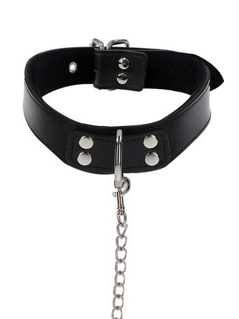 Κατασκευασμένο από άριστης ποιότητας PU, το σετ περιλαμβάνει ένα πανέμορφο κολάρο σε μαύρο χρώμα ιδανικό για kinky παιχνίδια ρόλων, με εσωτερική βελούδινη επένδυση ιδανική για πολύωρη χρήση χωρίς αποκαλυπτικά σημάδια και κοκκινίλες, και μία αποσπώμενη, μεταλλική, ασημένια αλυσίδα, η οποία καταλήγει σε έναν ταιριαστό ιμάντα για τον καρπό και συνδέεται σε αυτό μέσω ενός δακτυλίου-D στο μπροστινό τμήμα του κολάρου. Τυλίξτε απαλά το κολάρο στον λαιμό του Sub σας, συνδέσετε το λουρί και ο άτακτος εραστής σας θα “μεταμορφωθεί” σε χρόνο μηδέν στο αγαπημένο σας “pet ”.