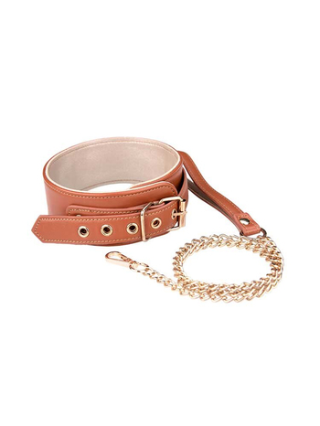 Κομψό και αριστοκρατικό, το σετ περιλαμβάνει ένα εντυπωσιακό κολάρο κατασκευασμένο από άριστης ποιότητας τεχνητό δέρμα, υλικό εξαιρετικά μαλακό και ανθεκτικό σε ζεστή απόχρωση του κονιάκ, η οποία προσδίδει πολυπλοκότητα και γοητεία με επιφάνεια διακοσμημένη με μεταλλικές λεπτομέρειες σε χρυσό χρώμα για έξτρα νότα πολυτέλειας και μία αποσπώμενη, μακριά, μεταλλική αλυσίδα ( λουρί) με ταιριαστό ιμάντα για τον καρπό. Το κολάρο ρυθμίζεται πλήρως και εφαρμόζει τέλεια σε όλα σχεδόν τα μεγέθη, ενώ ασφαλίζει μέσω μίας ανθεκτικής, αγκράφας για απόλυτα στιβαρά δεσίματα.