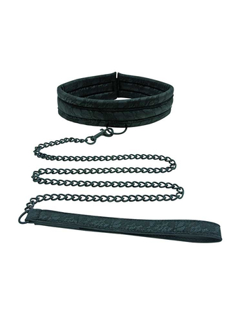 Το σετ περιλαμβάνει ένα μεταξένιο και απαλό στην αφή, κομψό, μαύρο κολάρο και ένα αποσπώμενο μακρύ μεταλλικό λουρί με έναν ταιριαστό ιμάντα για τον καρπό σας. Στο κέντρο του κολάρου θα βρείτε έναν μεταλλικό δακτύλιο-D, στον οποίο μπορείτε να συνδέσετε το λουρί ή οποιοδήποτε συμβατό αξεσουάρ έχετε ήδη στην κατοχή σας, ενώ το λουρί μπορεί να χρησιμοποιηθεί και μόνο του. Όπως και αν αποφασίσετε να μοιράσετε τους ρόλους στο παιχνίδι σας και οι δύο πλευρές θα το απολαύσετε δεόντως.