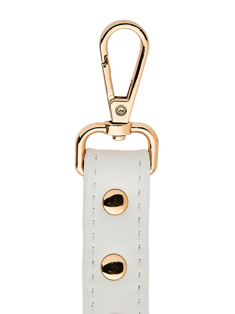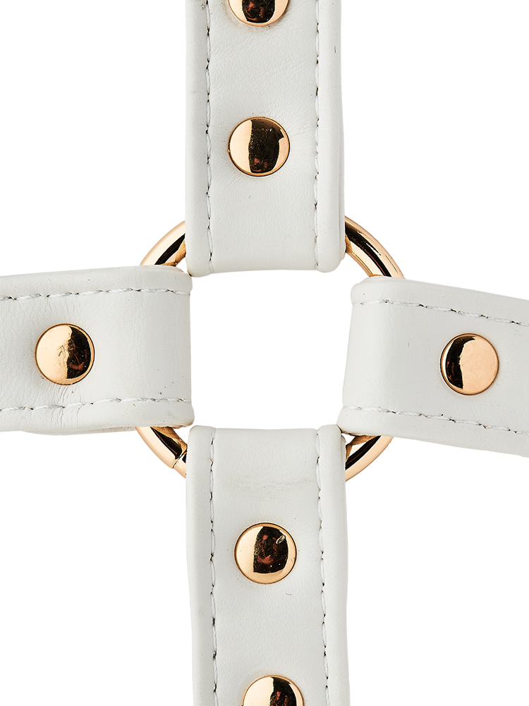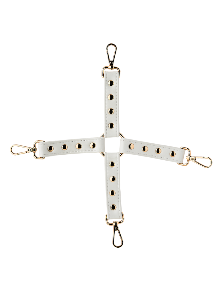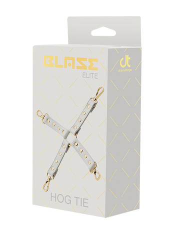 Κομψό αισθησιακό και σέξι, σε όμορφο λευκό χρώμα, με χρυσές μεταλλικές λεπτομέρειες στην επιφάνεια, κατασκευασμένο από συνθετικό δέρμα, υλικό εξαιρετικά μαλακό και ανθεκτικό, το Hog Tie είναι ένα ιδιαίτερα αξιόπιστο σύστημα δέσμευσης, το οποίο αποτελείται από τέσσερις δερμάτινες λωρίδες, οι οποίες ενώνονται μεταξύ τους μέσω τεσσάρων ανθεκτικών κλιπς σε έναν μεταλλικό δακτύλιο Ο. επιτρέποντάς σας να συνδέσετε ταυτόχρονα διαφορετικά bondage αξεσουάρ, όπως αλυσίδες, σχοινιά, χειροπέδες, ποδοπέδες ή οποιοδήποτε άλλο αντικείμενο θέλετε και… να ακινητοποιήσετε τον υποτακτικό σας με περισσότερους από έναν τρόπους
