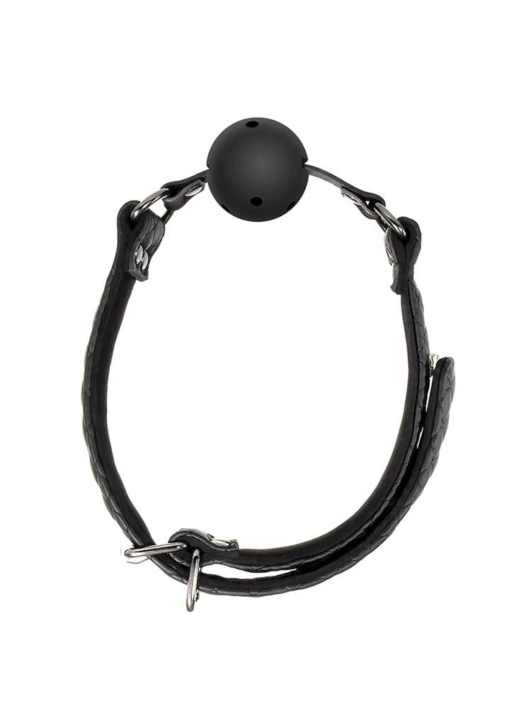 Το παιχνίδι αποτελείται από μία απόλυτα ασφαλή και υγιεινή, μη τοξική, πλαστική μπάλα με οπές αναπνοής για παιχνίδι διαρκείας και έναν ανθεκτικό, μαύρο ιμάντα με διακοσμητικά μεταλλικά τρουκς, κατασκευασμένο από ανάγλυφο PU με καπιτονέ σχέδια από τεχνητό δέρμα και νεοπρένιο σε σχήμα διαμαντιού, υλικά απόλυτα ασφαλή για το σώμα, ο οποίος ασφαλίζει μέσω μίας μεταλλικής αγκράφας, για απόλυτα σταθερό κράτημα και τέλεια ρύθμιση στα περισσότερα μεγέθη. Δύο απλά D-rings, ένα σε κάθε πλευρά, εξασφαλίζουν ποικιλία και δημιουργικότητα στο παιχνίδι σας. Προσθέστε όποιο άλλο bondage αξεσουάρ επιθυμείτε και απολαύστε ανεπανάληπτες στιγμές ηδονής.