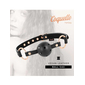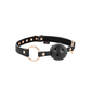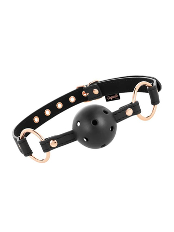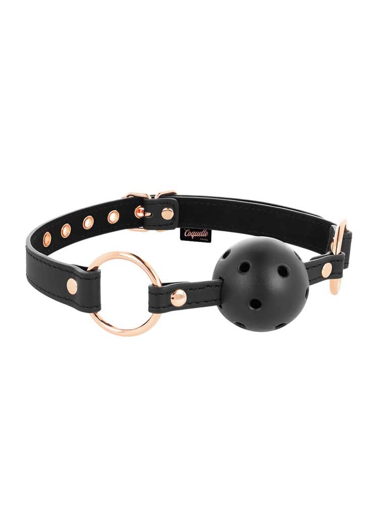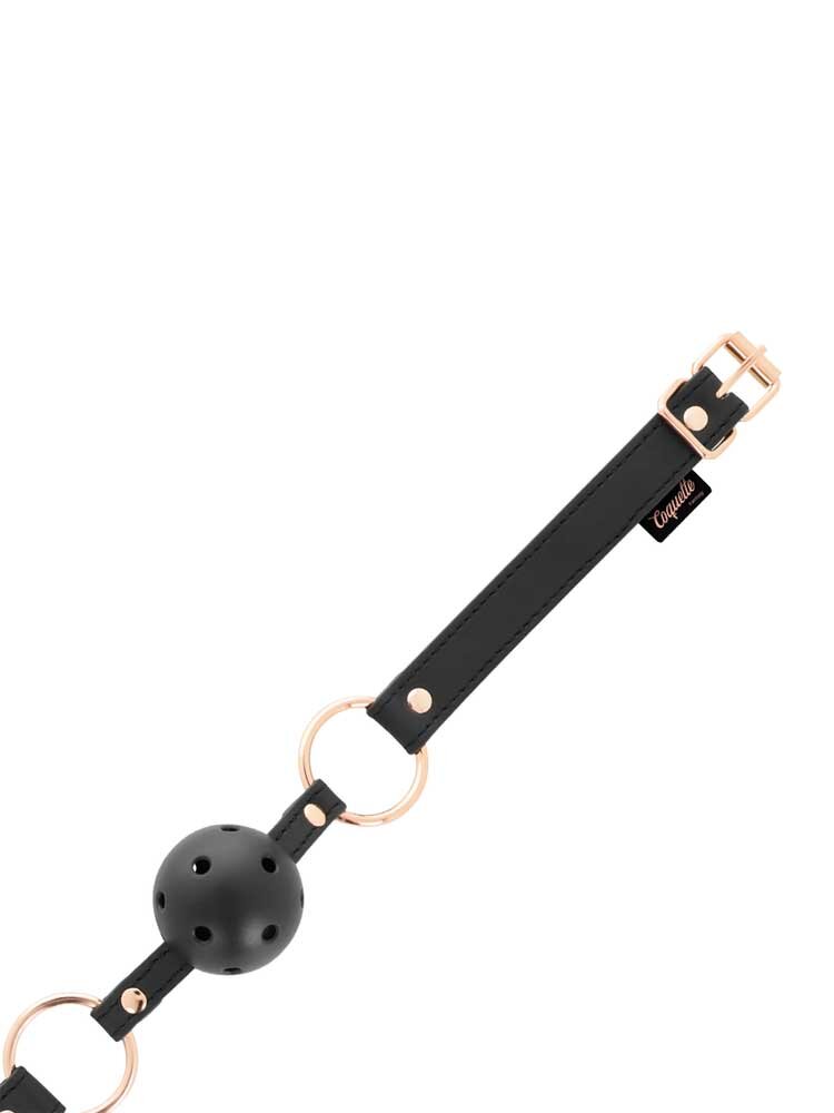 Κατασκευασμένο από συνθετικό δέρμα άριστης ποιότητας, υλικό εξαιρετικά ανθεκτικό, σε basic μαύρο χρώμα με μεταλλικές λεπτομέρειες σε ροζ- χρυσό για έξτρα αίσθηση πολυτέλειας, το φίμωτρο διαθέτει ρυθμιζόμενο κολάρο , το οποίο προσαρμόζεται σχεδόν σε κάθε μέγεθος και ασφαλίζει μέσω μίας μεταλλικής αγκράφας που το κρατά σταθερό στη θέση του, καθώς και μία διάτρητη μπάλα για εύκολη αναπνοή και απόλυτη ασφάλεια.