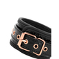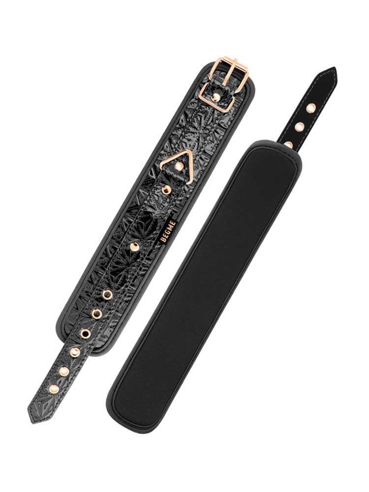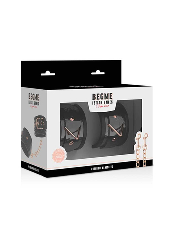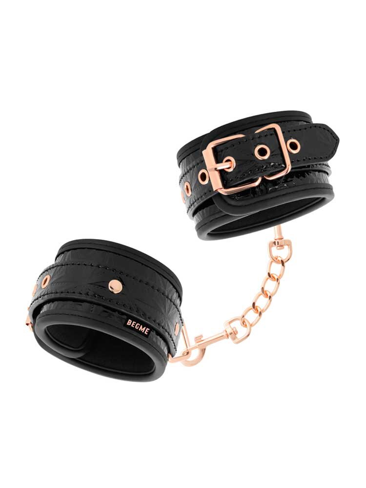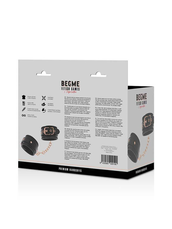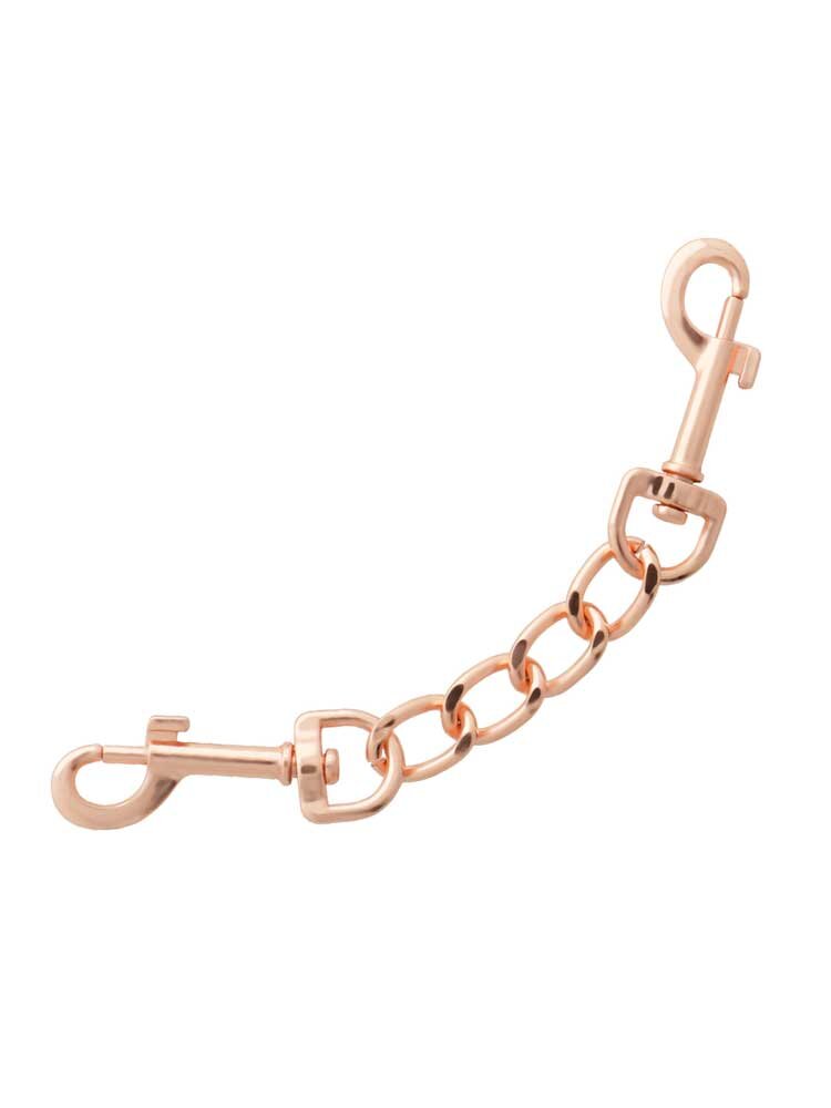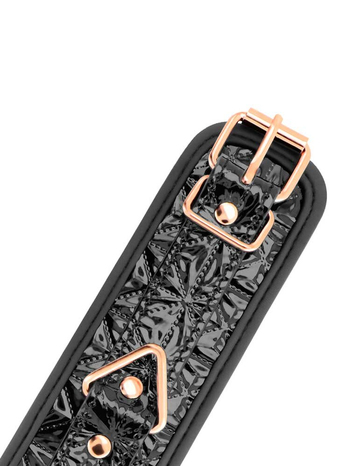 Ασφαλίζουν μέσω χρυσών μεταλλικών αγκραφών για απόλυτη ασφάλεια και προσαρμόζονται σχεδόν σε όλα τα μεγέθη. Μία μεταλλική, ροζ-χρυσή αλυσίδα ενώνει, μέσω στέρεων D-Rings τις δύο μανσέτες μεταξύ τους η οποία μπορεί και να αφαιρεθεί, προκειμένου να συνδέσετε στις χειροπέδες όποιο άλλο αξεσουάρ της συλλογής σας επιθυμείτε.