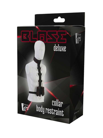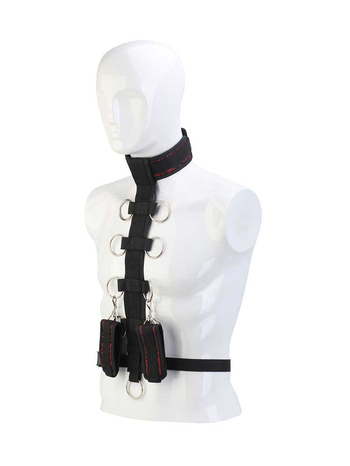 Το σετ αποτελείται από έναν κομψό, σέξι ιμάντα συγκράτησης σώματος με αποσπώμενο κολάρο και χειροπέδες διακοσμημένες με κόκκινες κεντητές λεπτομέρειες. Ο ιμάντας διαθέτει 9 μεταλλικά κλιπ σύνδεσης (δακτύλιοι), στα οποία μπορείτε να συνδέσετε τις μανσέτες σε όποιο ύψος επιθυμείτε, επιτυγχάνοντας διαφορετικά επίπεδα περιορισμού.