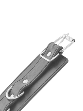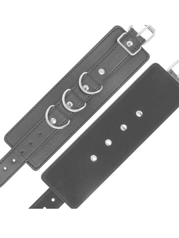 Κατασκευασμένες από άριστης ποιότητας τεχνητό δέρμα και επενδυμένες εσωτερικά από βελούδινα απαλή επίστρωση, ιδανική για πολύωρη χρήση χωρίς ερεθισμούς, οι χειροπέδες θα προσθέσουν μία μοναδική νότα πολυτέλειας στα παιχνίδια σας. Ασφαλίζουν μέσω μεγάλων μεταλλικών αγκραφών για απόλυτη ασφάλεια και προσαρμόζονται σχεδόν σε όλα τα μεγέθη, κρατώντας τον υποτακτικό σας απόλυτα ακινητοποιημένο, χωρίς καμία απολύτως δυνατότητα διαφυγής. Μπορούν είτε να συνενωθούν μεταξύ τους μέσω των δύο άγκιστρων που διαθέτουν είτε να συνδέσετε επάνω στα 3 μεταλλικά δαχτυλίδια της κάθε μίας, όποιο άλλο αξεσουάρ της συλλογής σας επιθυμείτε.