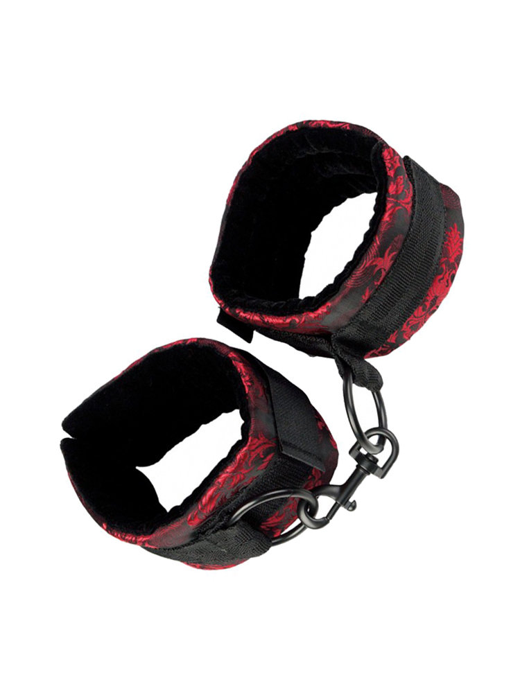 Η εξαιρετικά πολυτελής και εργονομική τους σχεδίαση και η ποιότητα των υλικών κατασκευής τους τις καθιστά ένα μοναδικό premium αξεσουάρ. Το μπροκάρ ύφασμα σε κόκκινο και μαύρο χρώμα με το οποίο είναι καλυμμένες, τους προσδίδει μία ιδιαίτερη νότα κομψότητας, ενώ η εξαιρετικά απαλή εσωτερική τους πλευρά αποσοβεί τον κίνδυνο σημαδιών από τη χρήση. Οι μανσέτες ασφαλίζουν και απασφαλίζουν με απλά Velcro, καθιστώντας εύκολη τη διαφυγή, ακόμη και στις στιγμές έντονου πάθους. Επιπλέον, στο εξωτερικό τους τμήμα υπάρχουν δύο μεταλλικά O - rings, στα οποία, μέσω του άγκιστρου ενεργοποίησης, μπορείτε να συνδέσετε και άλλα BDSM αξεσουάρ, όπως: σχοινιά, αλυσίδες κλπ, για ακόμη μεγαλύτερη διασκέδαση.