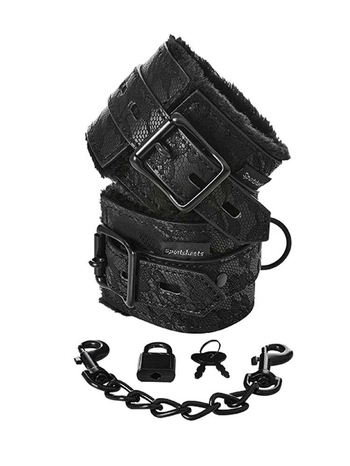 Καλυμμένες εσωτερικά με γούνινη επένδυση για άνετη, πολύωρη χρήση χωρίς σημάδια στο δέρμα και διακοσμημένες εξωτερικά με δαντέλα, οι Lace Fur Lined Hand Cuffs προσφέρουν υψηλή αισθητική χωρίς κανέναν απολύτως συμβιβασμό στην ανθεκτικότητα. Διαθέτουν λειτουργικούς ιμάντες με μεταλλικές αγκράφες για να προσαρμόζονται στο μέγεθος που επιθυμείτε και μία μικρή αλυσίδα, μέσω της οποίας μπορούν να συνδεθούν μεταξύ τους. Επιπλέον, διαθέτουν και μικρό λουκέτο με δύο κλειδιά για αυστηρή ακινησία όπου και όποτε αυτή χρειάζεται.