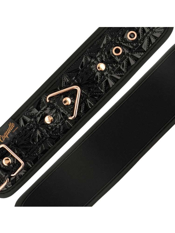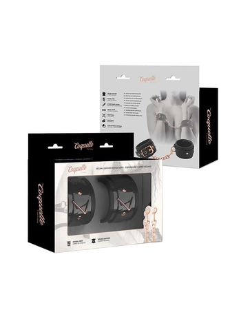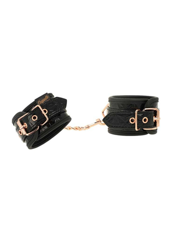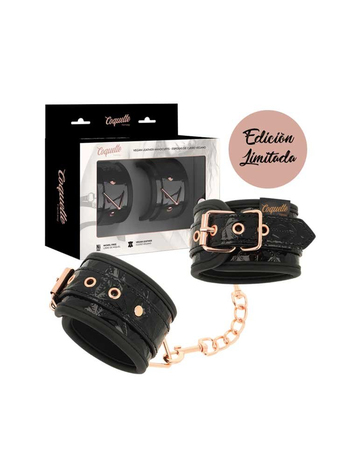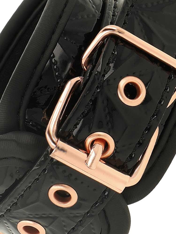 Ασφαλίζουν πλήρως μέσω ρυθμιζόμενης, μεταλλικής πόρπης, τύπου αγκράφας και προσαρμόζονται τέλεια στις επιθυμητές κάθε φορά διαστάσεις. Μία αποσπώμενη μεταλλική, ροζ-χρυσή αλυσίδα ενώνει, μέσω στέρεων D-Rings, τις δύο μανσέτες μεταξύ τους για πλήρη ακινητοποίηση. Στους δακτυλίους μπορείτε να προσαρτήσετε και άλλα bondage αξεσουάρ της συλλογής σας για να εμπλουτίσετε το παιχνίδι σας.