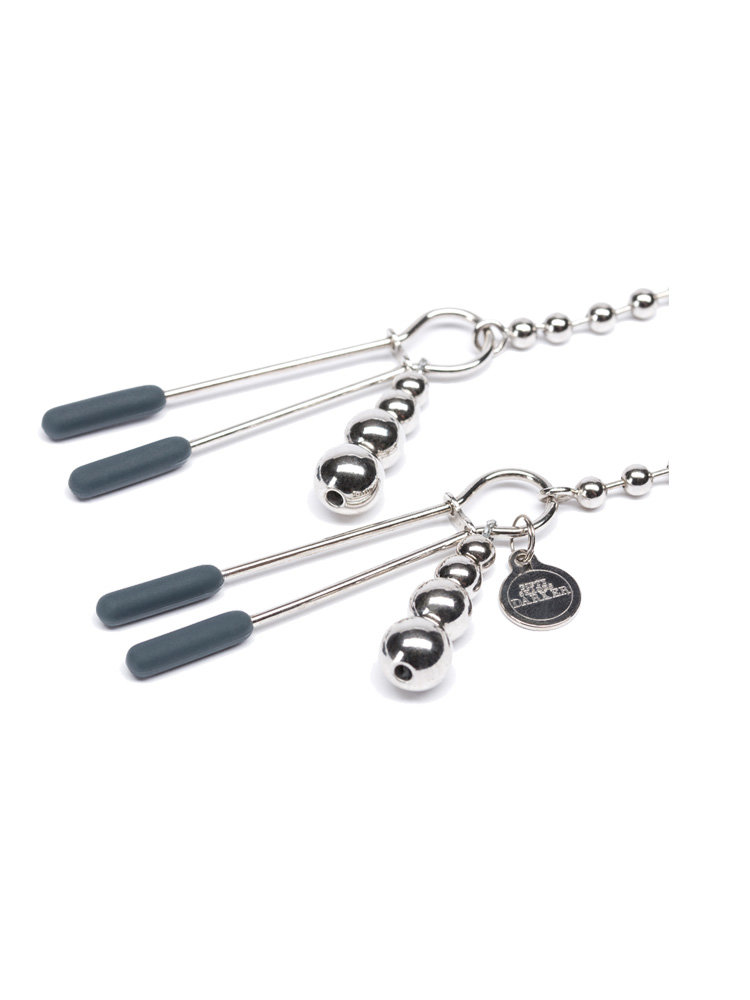 Για εσάς που επιθυμείτε να ξεκινήσετε το ταξίδι σας στον συναρπαστικό κόσμο της BDSM διασκέδασης, να εξερευνήσετε νέα πεδία διασκέδασης και να πειραματιστείτε με ένα μεθυστικό κράμα ευχαρίστησης και πόνου, το Beaded Chain Nipple Clamps, At my Mercy, μέρος της επίσημης συλλογής Fifty Shades Darker, είναι αναμφίβολα το κατάλληλο, ερωτικό αξεσουάρ.