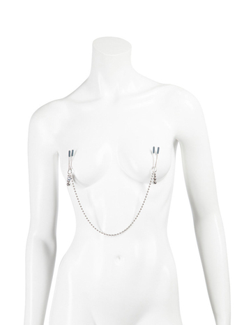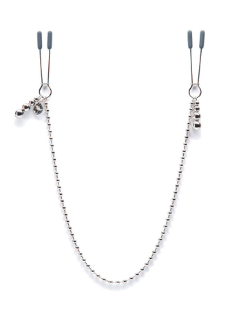 Τραβήξτε όλα τα βλέμματα επάνω σας με το εξαιρετικό αυτό κόσμημα και νοιώστε πιο ποθητή από ποτέ! Παγιδέψτε τις θηλές σας ανάμεσα στους σφικτήρες και ρυθμίσετε την ένταση της πίεσης ανάλογα με τη διάθεσή σας. Οι σφιγκτήρες είναι καλυμμένοι με καουτσούκ, προκειμένου να αποσοβείται η πιθανότητα τραυματισμού ή/και εκδορών της επιδερμίδας, ενώ συνδέονται μεταξύ τους με μια κομψή ασημένια αλυσίδα, το άγγιγμα της οποίας πάνω στο γυμνό σας δέρμα θα ξεσηκώσει περαιτέρω τις αισθήσεις σας. Επιπλέον, στις δύο άκρες της αλυσίδας είναι τοποθετημένες χάντρες για ακόμη μεγαλύτερη διέγερση, οι οποίες χαρίζουν στο ιδιαίτερο αυτό αξεσουάρ μία νότα πολυτέλειας.