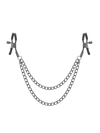Οι σφιγκτήρες είναι καλυμμένοι με pads σιλικόνη, προκειμένου να αποσοβείται η πιθανότητα τραυματισμού ή/και εκδορών της επιδερμίδας, τα οποία μπορούν να αφαιρεθούν αν σας αρέσουν οι “άγριες απολαύσεις”, ενώ επάνω στις δύο υποδοχές, υπάρχουν δύο βίδες, μέσω των οποίων ρυθμίζεται η ένταση της πίεσης, ανάλογα με τις επιθυμίες σας. Οι σφιγκτήρες συνδέονται μεταξύ τους με μια ασημί, διπλή μεταλλική αλυσίδα, η οποία θα σας προσφέρει ένα υπέροχα αισθησιακό άγγιγμα απαλότητας.
