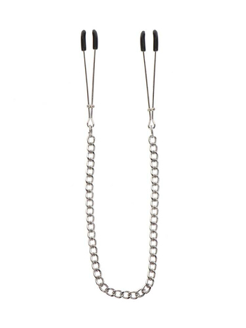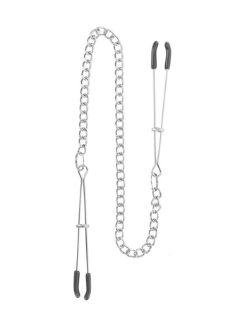 Το σετ περιέχει δύο καλοσχεδιασμένους σφιγκτήρες, τύπου τσιμπίδας, οι οποίοι θα τονώσουν με μοναδική ακρίβεια τις θηλές σας, προσφέροντάς σας ξεχωριστή ευχαρίστηση. Στο σημείο επαφής με το δέρμα οι σφικτήρες είναι καλυμμένοι με καουτσούκ για να προστατεύουν την επιδερμίδα σας και να εξασφαλίζουν επιπλέον άνεση και ασφάλεια, ενώ συνδέονται μεταξύ τους με μια κομψή ασημένια αλυσίδα, η κίνηση της οποίας θα ξεσηκώσει περαιτέρω τις αισθήσεις σας.