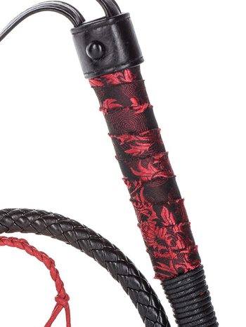 Το δερμάτινο μαστίγιο διαθέτει μονή χειροποίητή ουρά, περίτεχνα πλεγμένη, καθώς και μία εντυπωσιακή λαβή από σατέν μπροκάρ ύφασμα σε κόκκινο-μαύρο! Στην άκρη της λαβής θα βρείτε ένα στέρεο λουράκι καρπού, για βέλτιστη σταθερότητα και μέγιστο έλεγχο των χτυπημάτων.
