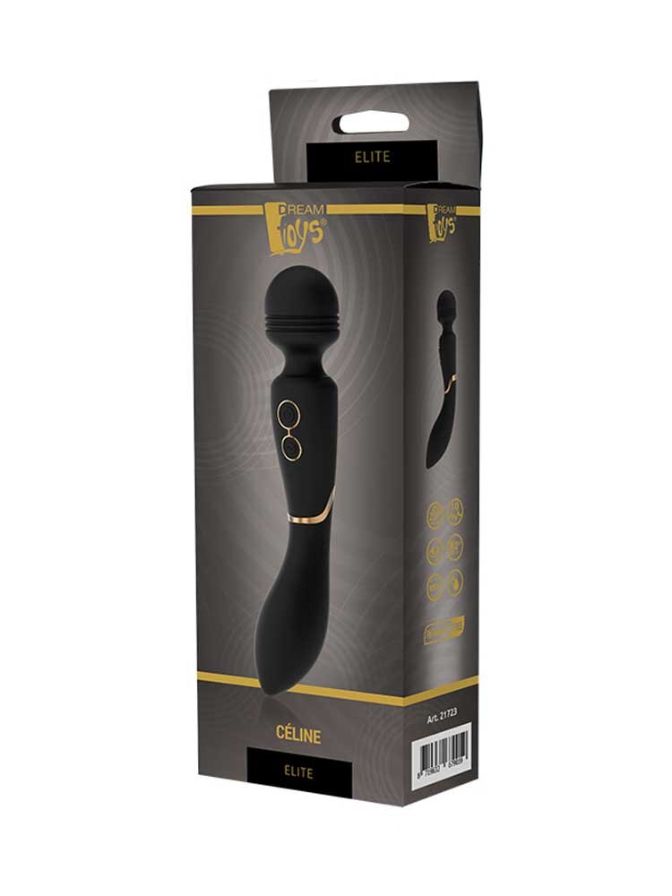 Πολυτελής, κομψός και καλαίσθητος, σε υπέροχο μαύρο χρώμα με διακριτικές χρυσές λεπτομέρειες ο Céline υπόσχεται να σας προσφέρει μοναδικές στιγμές ευχαρίστησης. Εξοπλισμένος με μία στιβαρή, συμπαγή λαβή για άνετο κράτημα, ο μοναδικός αυτός massager διαθέτει δύο διαφορετικά άκρα προς χρήση. Το ένα, μέσω ενός εύκαμπτου λαιμού, καταλήγει σε μία ευρεία, στρογγυλή κεφαλή, κατάλληλη για την τόνωση της κλειτορίδας και των άλλων εξωτερικών ερωτογενών ζωνών, (θηλές, περινέο, βαλάνο πέους), ενώ το άλλο σε ένα ελαφρώς κυρτό και μυτερό άκρο, ιδανικό για τόνωση του κόλπου και του G-spot.