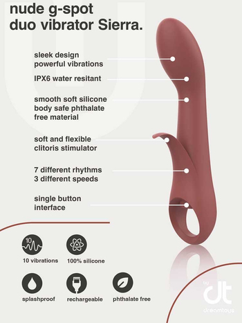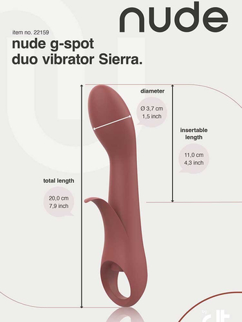Ξεκλειδώστε την πραγματική ουσία της ευχαρίστησης, και απολαύστε μαγικές στιγμές διπλής διέγερσης με τη βοήθεια του υπέροχου Sierra G-spot Duo Vibrator, του νέου διπλού δονητής από τη Nude.