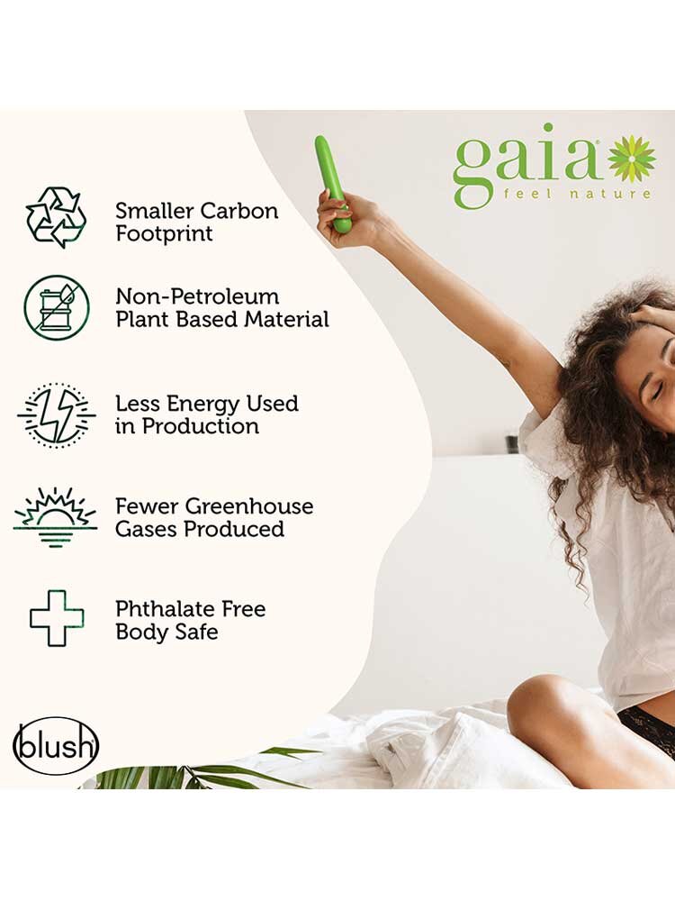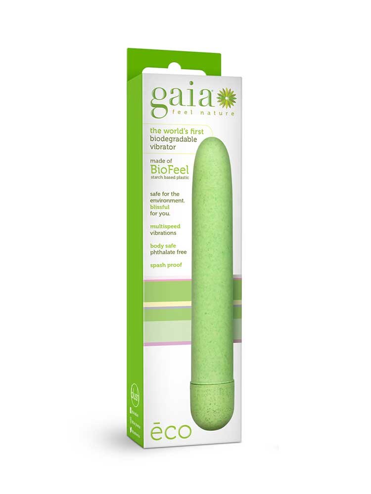 Ο Gaia Eco είναι κατασκευασμένος από Biofeel, ένα βιοπλαστικό υλικό με βάση το άμυλο και είναι σχεδιασμένος ώστε να καταναλώνει ελάχιστη ενέργεια και να δημιουργεί λιγότερες εκπομπές αερίων του θερμοκηπίου από οποιοδήποτε άλλο σεξουαλικό παιχνίδι στην αγορά. Μπορεί να χρησιμοποιηθεί και στο μπάνιο. (Δεν επιτρέπεται να τον βυθίζετε).
