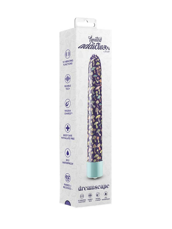 Λιτός και διακριτικός, σε υπέροχο μπλε χρώμα, εκτυπωμένη με ένα όμορφο, πολύχρωμο μοτίβο επιφάνεια, λεία, ομαλή υφή και άριστη λειτουργικότητα, ο Dreamscape είναι εξοπλισμένος με έναν μακρύ και λεπτό κορμό με στρογγυλεμένη άκρη για άνετη διείσδυση, εύκολο εντοπισμό και έντονη διέγερση του πολυθρύλητου σημείου G και ένα ισχυρό μοτέρ, ενισχυμένο με την τεχνολογία RumbleTech και εφοδιασμένο με 10 λειτουργίες δόνησης (5 ταχύτητες και 5 μοτίβα) για να επιλέγετε κάθε φορά αυτή που σας ικανοποιεί. Επιπλέον, διαθέτει ένα ελαφρά ανυψωμένο κουμπί + και ένα επίπεδο κουμπί – για ευκολότερο έλεγχο ακόμη και στο σκοτάδι.
