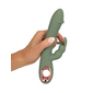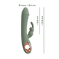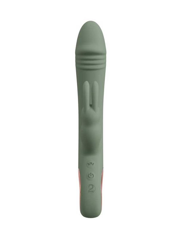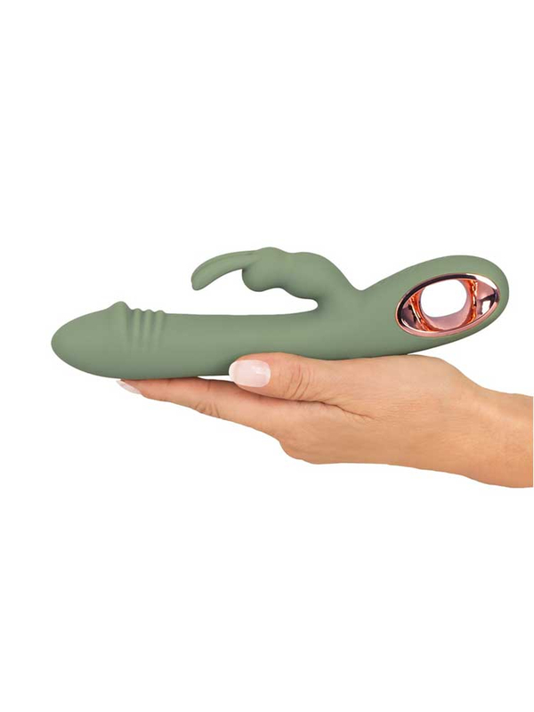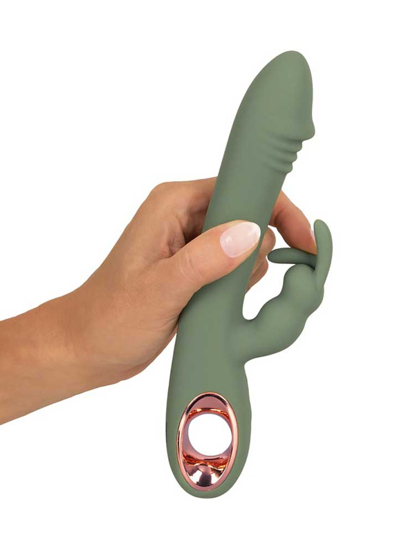 Κομψός και σέξι, σε υπέροχο πράσινο χρώμα της ελιάς, με δυναμικό σχεδιασμό και μέγιστη λειτουργικότητα, ο Slim Rabbit είναι ιδανικός για ταυτόχρονη διπλή διέγερση. Διαθέτει έναν ευθυτενή, στιβαρό άξονα με μία ευρεία ωοειδή κεφαλή που θυμίζει βάλανο, η οποία εξυπηρετεί την άνετη διείσδυση και τον γρήγορο εντοπισμό και διέγερση του μαγικού g-spot και ένα μικρότερο, αλλά ιδιαίτερα παιχνιδιάρικο στέλεχος, με αυτάκια στραμμένα προς τα πάνω και έντονα διεγερτικά εξογκώματα, το οποίο στοχεύει την κλειτορίδα προσφέροντάς σας ονειρεμένους, μαγικούς οργασμούς. Ένα χρυσό δαχτυλίδι στη βάση του εξασφαλίζει άνετο, σταθερό κράτημα, καθιστώντας τον εξαιρετικά εύχρηστο και πρακτικό στη χρήση.