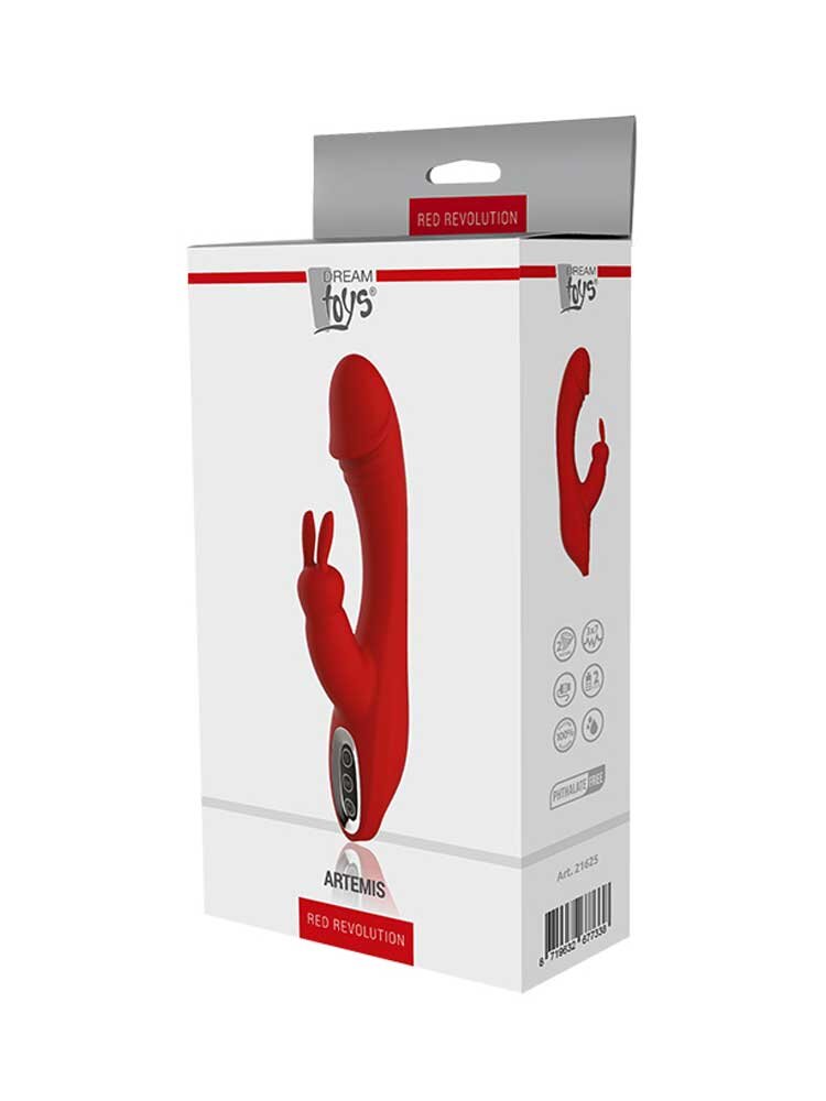 Κομψός, πολυτελής και φινετσάτος, σε ένα προκλητικό κόκκινο της φωτιάς, ο Artemis, θα σας ενθουσιάσει με την ομαλή, λεία υφή του, την άψογη ρεαλιστική του σχεδίαση και την άριστη λειτουργικότητά του. Το λεπτό και στιβαρό μα συνάμα λυγερόκορμο, εύκαμπτο σώμα του σε σχήμα “αληθινού μορίου” με την καλοφτιαγμένη, πτυχωτή, καμπυλόγραμμη βάλανο, σχεδιασμένη να διεισδύει εύκολα στον κόλπο και να τονώνει τις ερωτογενείς εσωτερικές σας ζώνες και …το δυσεύρετο G-spot, θα βάλει φωτιά στις αισθήσεις σας, ενώ το μικρότερο κλειτοριδικό στέλεχος, εξοπλισμένο με 2 μαλακά, λαγουδίσια αυτάκια θα στοχεύει την σαρκώδη φύση σας, οδηγώντας σας σε οργασμικές εκρήξεις.