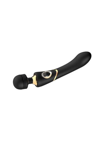 Υψηλής αισθητικής και ποιότητας, σε υπέροχο μαύρο χρώμα με πολυτελείς, χρυσές λεπτομέρειες, κομψό, εργονομικό σχεδιασμό και άριστη λειτουργικότητα, ο Massager διαθέτει ευρεία, στρογγυλή κεφαλή με κυκλικές ραβδώσεις στη βάση της για έξτρα διέγερση, εύκαμπτο λαιμό για μεγαλύτερο εύρος κινήσεων και μία λεία, στιβαρή λαβή, ελαφρά στρογγυλεμένη στο κάτω μέρος για άνετο, σταθερό κράτημα, στο μέσον της οποίας είναι τοποθετημένο το κουμπί χειρισμού, σε σχήμα πολύτιμου λίθου, στολισμένο με πετράδια. Ένα απαλό άγγιγμα στο μπουτόν είναι αρκετό για να ελεγχθεί ο δονητής. Όταν ενεργοποιείται ανάβει ένα μπλε φως LED.