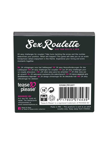 Μια περιστροφή του βέλους αρκεί για να απογειώσετε τον ενθουσιασμό σας για το σεξ, αφού με κάθε γύρισμα της ρουλέτας το βέλος της δείχνει έναν αριθμό, ο οποίος παραπέμπει σε μια ερωτική πρόκληση/στάση που πρέπει να πραγματοποιήσετε.
