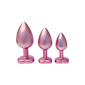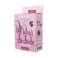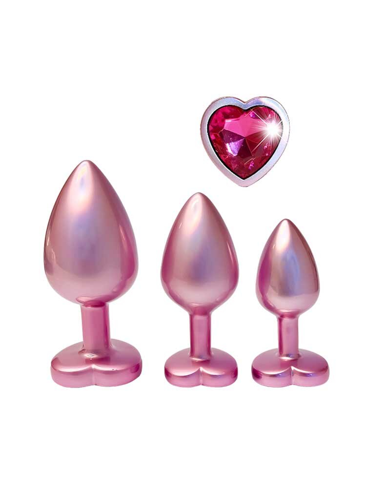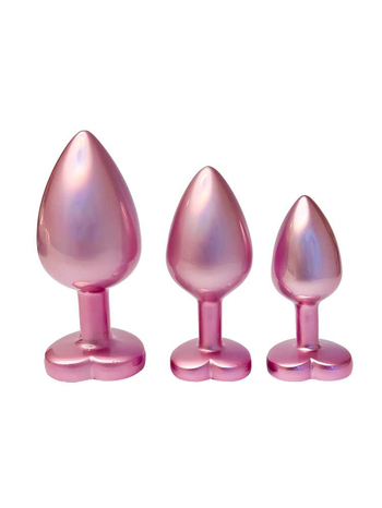 Το set περιέχει τρία διαφορετικού μεγέθους πρωκτικά βύσματα σε ένα ιδιαίτερο ροζ περλέ χρώμα. Σχεδιασμένα με γνώμονα την ασφαλή ευχαρίστηση, τα εκλεπτυσμένα αυτό βύσματα διαθέτουν ομαλή και λεία επιφάνεια και λεπτή, ελαφρά στρογγυλεμένη άκρη, η οποία θα μετατρέψει τη διείσδυση σε μια αισθησιακή, μεστή εμπειρία. Νιώστε τη γεμάτη, έντονη αίσθηση του μετάλλου μέσα σας, είτε διασκεδάζετε με τον εραστή σας, είτε μόνοι σας. Η ευρεία βάση τους, διακοσμημένη με ένα μικρό, ροζ “πετράδι” σε σχήμα καρδιάς, εξασφαλίζει ασφάλεια και σταθερότητα, όσο σκληρά, βαθιά και γρήγορα κι αν επιθυμείτε να το πάτε!