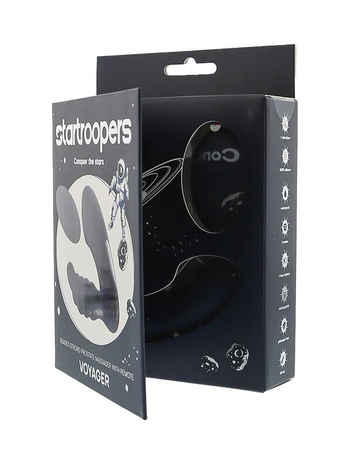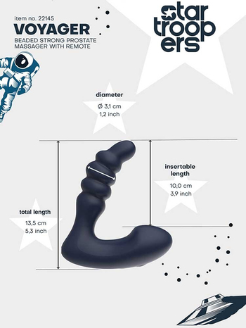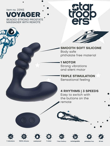 Επιβιβαστείτε στο προσωπικό σας διαπλανητικό σκάφος με τον υπέροχο Voyager Prostate Massager with Wireless Remote, τον νέο, πρωκτικό δονητή με χάντρες και ασύρματο τηλεχειριστήριο από τη συλλογή Startroopers και απολαύστε μαγικές βόλτες στα αστέρια.