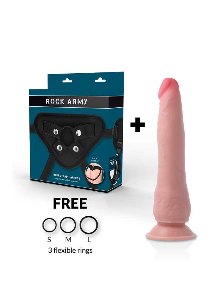 Και μαζί του το απαραίτητο συνοδευτικό αξεσουάρ! Η υπέροχη Rock Army Four Strap Harness, η εξαιρετική γυναικεία ζώνη από PU με μεταλλικές λεπτομέρειες, σε επιβλητικό μαύρο χρώμα, σχεδιασμένη να εφαρμόζει τέλεια γύρω από τη μέση ή τους γλουτούς, χάρη στους τέσσερις πλήρως ρυθμιζόμενους, νάιλον ιμάντες της και το καλαίσθητο κλείσιμο στο πίσω μέρος της, το οποίο της χαρίζει ξεχωριστή νότα πολυτέλειας. Στο κέντρο της ζώνης υπάρχει υποδοχή, στην οποία τοποθετούνται τα ομοιώματα για… ολοκληρωμένη διασκέδαση. Στη συσκευασία θα βρείτε επιπλέον 3 εύκαμπτους δακτυλίους διαφορετικών μεγεθών για να εναλλάσσετε όλα τα μεγέθη dildos της εταιρίας.