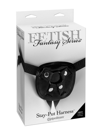 Κατασκευασμένο από ασφαλή για το σώμα υλικά, η πίσω πλευρά του Stay-Put είναι από βελούδινα μαλακό νεοπρένιο, το οποίο αφήνει μία ιδιαίτερα απαλή αίσθηση στην επαφή του με το δέρμα, καθώς δεν τρίβεται πάνω του και δεν αφήνει σημάδια, ενώ τα εξαιρετικά ανθεκτικά λουριά του είναι απόλυτα ρυθμιζόμενα, έχουν τέλεια εφαρμογή και ταιριάζουν σε περιφέρειες έως και 112cm και σε μηρούς έως και 102cm. Το μπροστινό τμήμα από βινύλιο, περιλαμβάνει τέσσερις μεταλλικές θήκες, οι οποίες ασφαλίζουν το O-Ring που κάθε φορά επιλέγετε και κρατούν τα πάντα στη θέση τους, ακόμη και όταν το παιχνίδι έχει ανάψει για τα καλά. Το παιχνίδι διαθέτει 3 δαχτυλίδια σιλικόνης διαφορετικού διαμετρήματος για να μπορείτε να εφαρμόζετε όλα τα μεγέθη ομοιωμάτων της συλλογής σας, διαμέτρου έως 5cm! Κατάλληλο για όλα τα επίπεδα εμπειρίας.